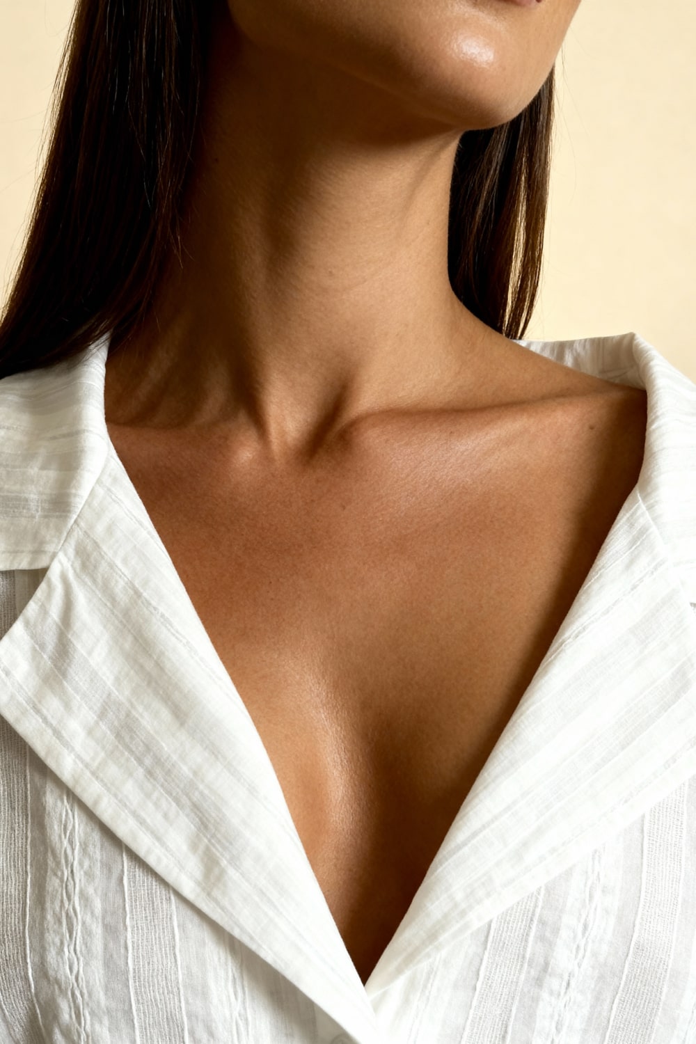 Il completo Marguerite in garza di cotone bianco sporco incarna l'eleganza bohemien con un tocco romantico. Questo raffinato completo a due pezzi è composto da una giacca da pigiama con bottoni e un pantalone coordinato, entrambi realizzati in una garza di cotone leggero e testurizzata. La giacca presenta un colletto classico, una chiusura con bottoni sul davanti e maniche con volant delicati che aggiungono una nota femminile. Il pantalone con vita elastica offre una vestibilità fluida e confortevole con gambe ampie decorate con volant in fondo per un effetto bohemien chic. Il materiale in garza di cotone testurizzato conferisce una dimensione artigianale e sofisticata al completo, mentre la cintura da annodare in vita consente di regolare la silhouette. Un pigiama elegante che può essere indossato sia per dormire che per rilassarsi con stile.